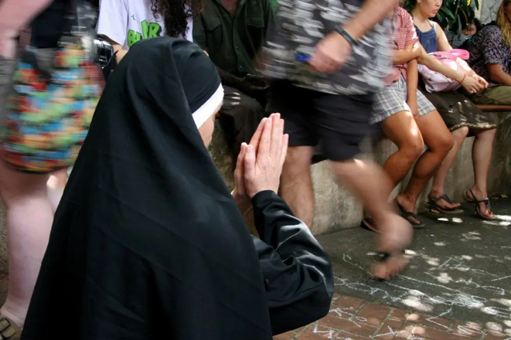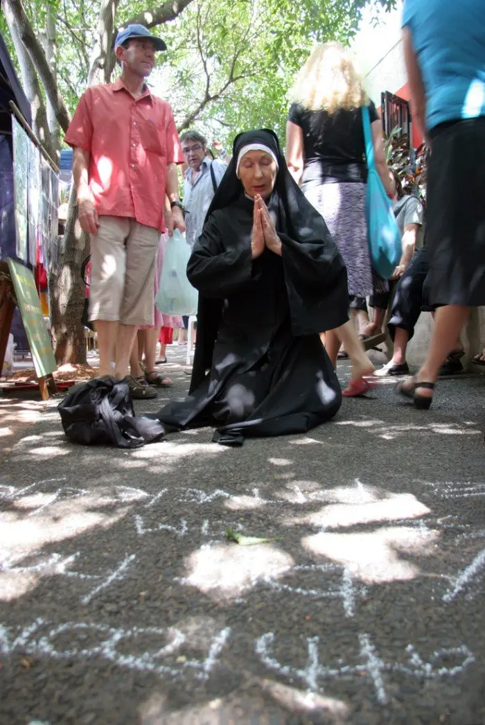 Earlier in 2007 I created the collaborative work, The Crossing (see these details with that work). This was about overlapping cultural relations to place One character in The Crossing was the missionary nun that I performed but my focus was directing the overall work and so this character that historically had a direct and often fraught involvement with Aboriginal people was under developed. The Nun was the vehicle for A Prayer which is spoken from her perspective both as an instrument from the colonial past whose initial Christian mission was to convert 'the natives'. The missions provided food, clothing, education, and taught girls for example to be maids in the service of the large station owners. In exchange their Aboriginal charges would convert to Christianity. This for some had positive outcomes like an education but for many it served to alienate them from their land and culture that as we now know is a source of illness and dissociation. Although A Prayer is about an act of reconciliation with the indigenous people and in particular with the Larrakia people on whose land the work took place, A Prayer speaks as much about the current crumbling of belief systems in the face of the all consuming materialism that is the global stage.