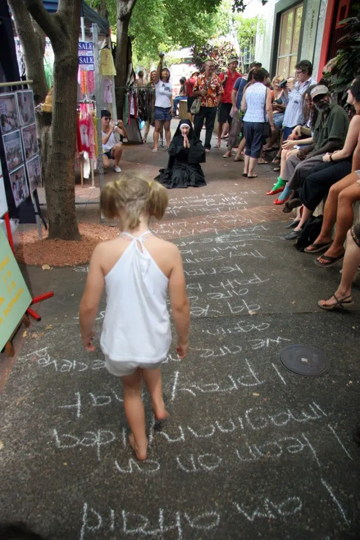 Performed for Interpositions at 24hr art, August 2007, Darwin Festival This performance is a response to the Interpositions brief of unannounced performances located in public spaces. A background. A Prayer is a direct response to the Prime Minister John Howard's recent directive to send the police and army into Aboriginal communities in an attempt to stop child abuse. There is fear that this move is a guise for a federal government land grab because most Aboriginal land in the Northern Territory sits on uranium, mined or otherwise. Howard's vision to embrace uranium as the clean green fuel of the future ensuring Australian economic growth through international sales depends on government control of this land. A ninety-nine year lease of Aboriginal land is proposed by the government that would enable subleasing. The worry is that this will be subleased to uranium mining companies. Another aspect is that uranium mines will take at least fifteen to twenty years to become productive with the uranium reserves only lasting thirty to fifty years. A very short-term solution. Where time, in terms of urgency is of the essence to begin to stem green house gasses. Australia is abundant in alternate fuel possibilities that don't leave dangerous wastes buried for hundreds of years, as uranium will do. So if this scenario plays out at the end of ninety-nine years the land is returned permanently poisoned. A great deal! The social cost for Aboriginal people starting with colonisation through to the present is ongoing. It is currently felt in Aboriginal communities through the lack of education, health and economic status. Initiatives like the community development employment programs that are working well in some communities are threatened with dismantling under this action. Some of the art centres where Aboriginal communities produce their paintings of both cultural and economic significance as well as some health centres have already had the funding stopped several years ago by this government. These custom-built buildings stand locked up and unused. This is a complex issue that I cannot pretend to know all the answers, particularly coming as a middle class white outsider from Melbourne.My information is dependent on mediated sites and it does not include that which is suppressed. It is the articulation of fears and anxieties amongst solid facts that inform my reading as a reflection of social and environmental concern.