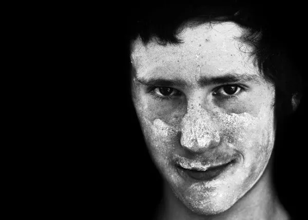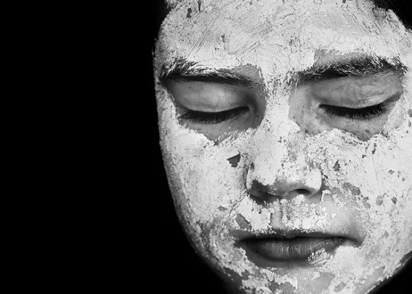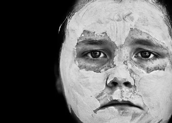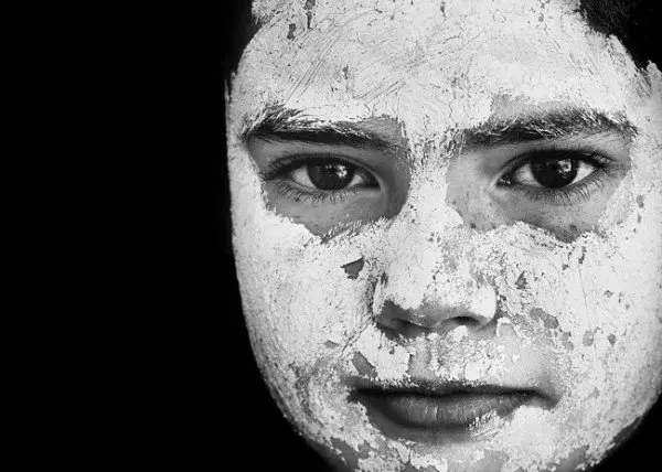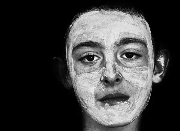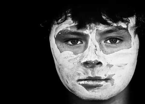 Jill Orr’s photographs of children from Avoca Primary School are participatory performances, scripted for the camera. Each individual child was masked up with white clay and asked to pose with their eyes shut and then with their eyes open. The clay gives the group a ritualised quality, as if each were part of a much larger event.