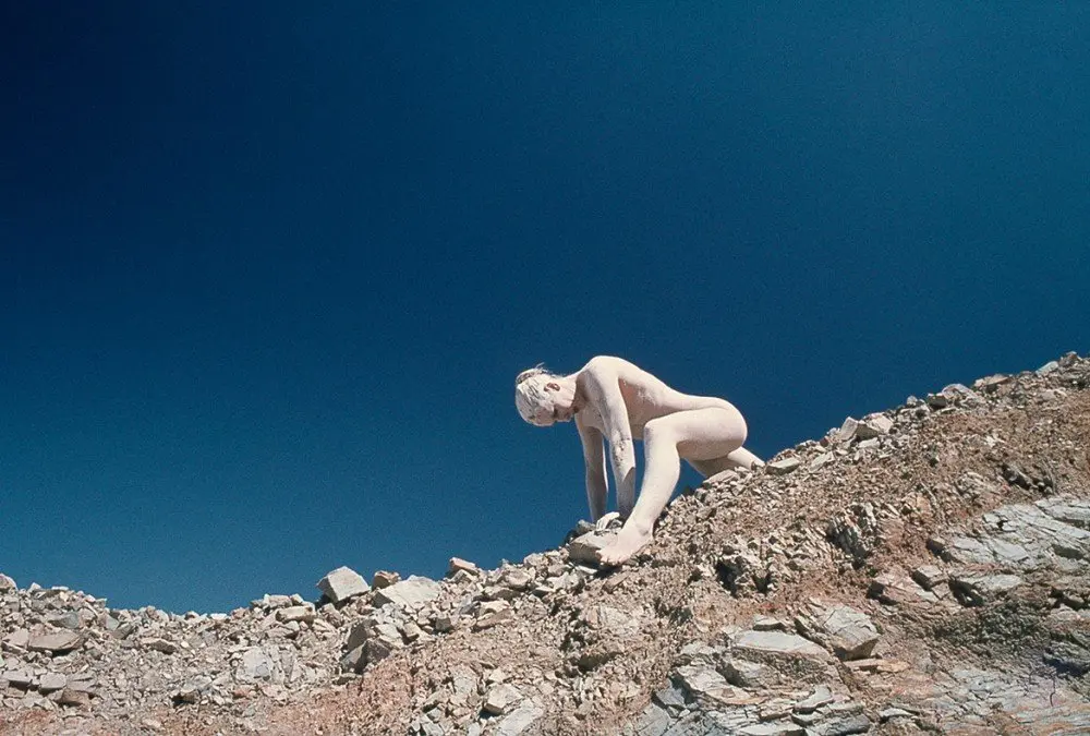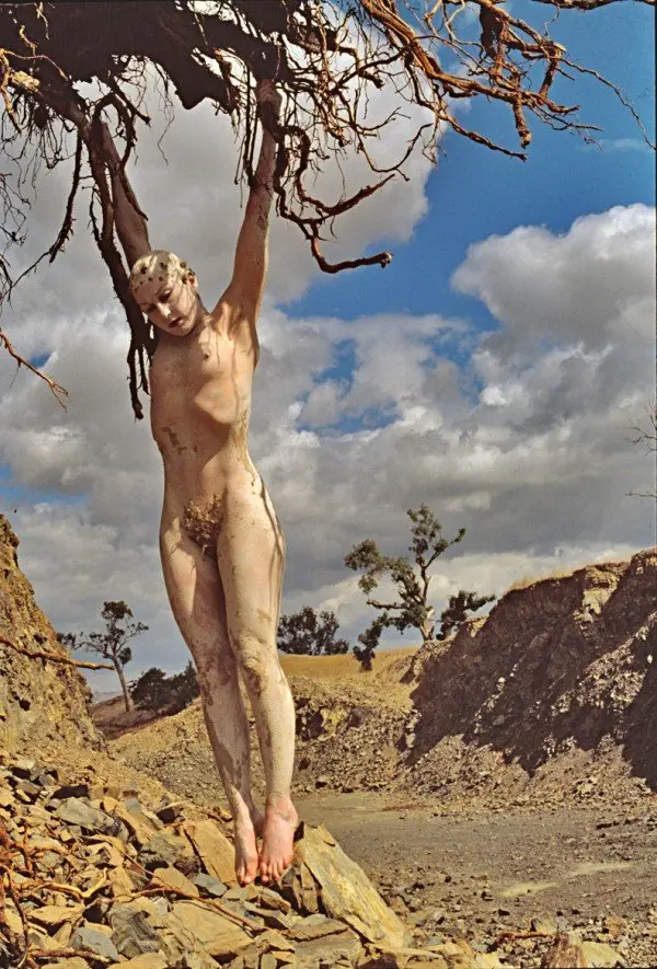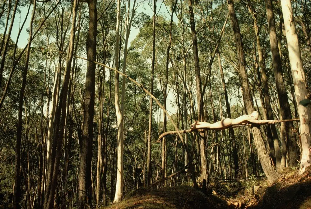 This work consists of twenty-one images that were photographed in various Victorian landscapes that projected within the live performance. The images are the representational art work. The original is shot on 35mm slide film. Bleeding Trees is an early environmental work where the body is used as an 'emotional barometer' placed in empathy with the natural and unnatural life cycles of trees. The empathy enlisted through the viewer is through identification with the human body. As female, the early feminist critique places the naked body as 'pandering to the male gaze'. In an environmental sense it is a gaze towards all.