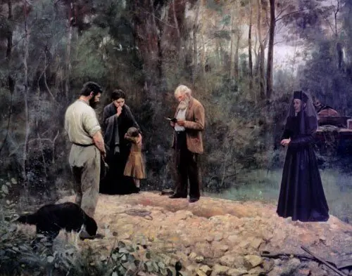 Commissioned by Geelong Art Gallery in 1999, this performance was based on The Bush Burial painted by Frederick McCubbin in 1910, which is in the gallery's collection. The performance looked into the mystery of the painting. Who has been buried? The Bush Burial has an open grave and no one knows who has died. The grave was actually a construction of McCubbin's , created in his back yard in Macedon.