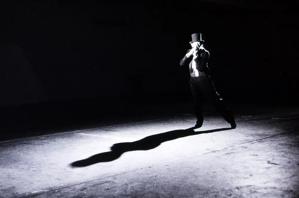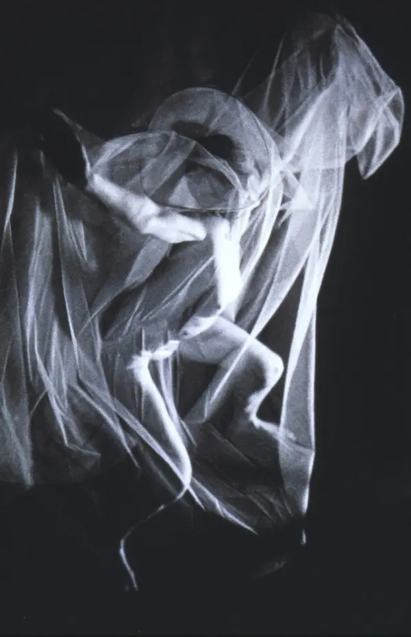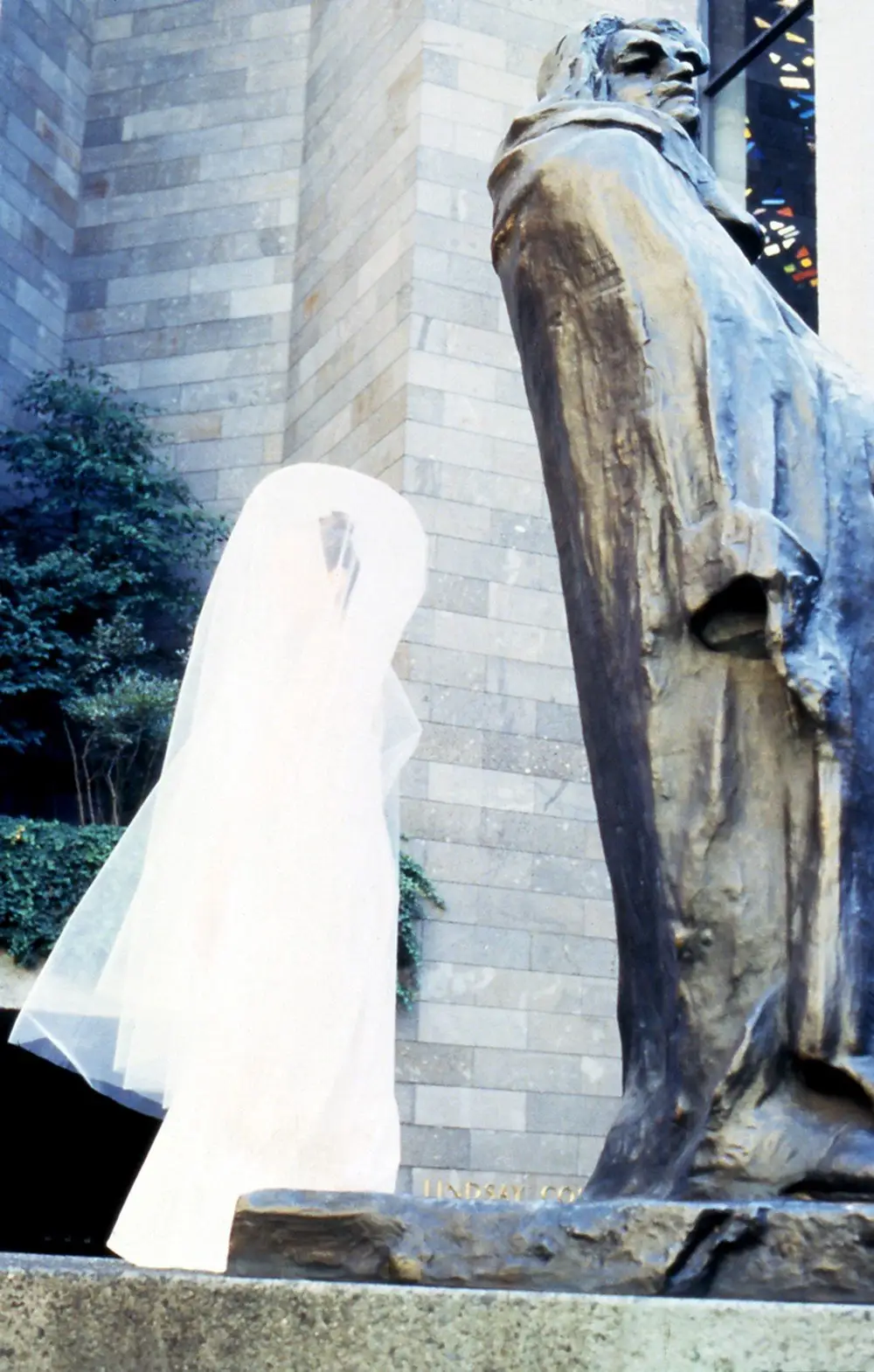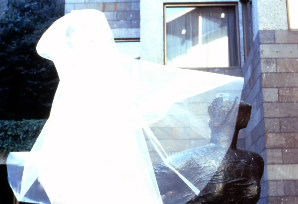 This work was performed at the National Gallery of Victoria for the Drydocks and Slipways Celebrating Women Program, Access Gallery, 1994. This is a complex work structured around Marcel Duchamp's The Bride Stripped Bare by his Bachelors Even. I used this opportunity, as an artist who has dedicated my life to art, to symbolically marry the Art Institution and pay homage to my elders. To marry, I needed permission and blessings from the mothers and fathers of Modern Art. There were no mothers available so I chose the fathers, Henry Moore with his Draped Seated Woman, an ode to archetypal woman and Rodin and his famous Balzac, ode to individualization. These sculptures were in the forecourt of the early National Gallery of Victoria (now NVG, International). The third father is Marcel Duchamp's with The Bride Stripped Bare by his Bachelors Even. I performed the bride, the bachelor, plus the androgenous character of my own insertion. This gender exploration looks at the shades of grey in between the definitive extremes where there exist multiple and fascinating variations on all binary assumptions.