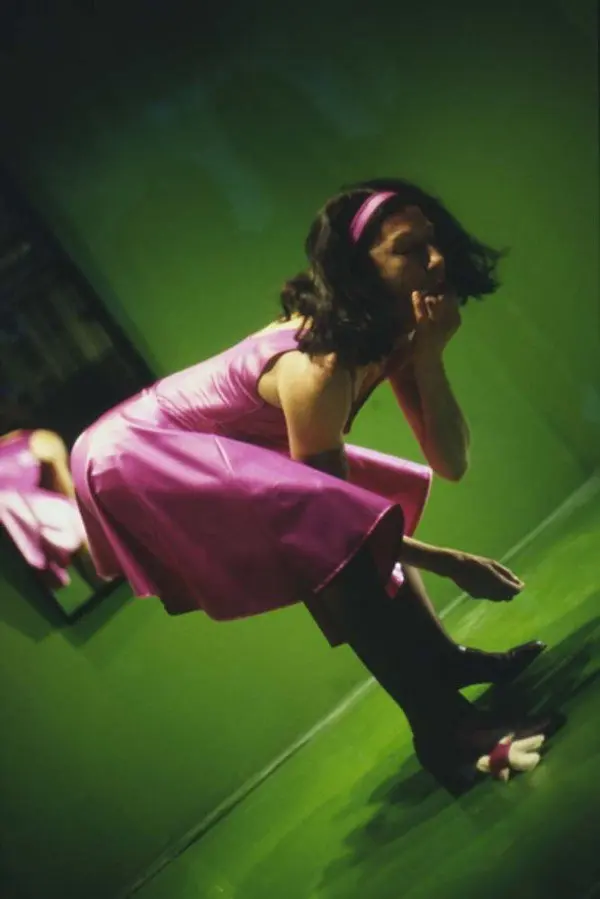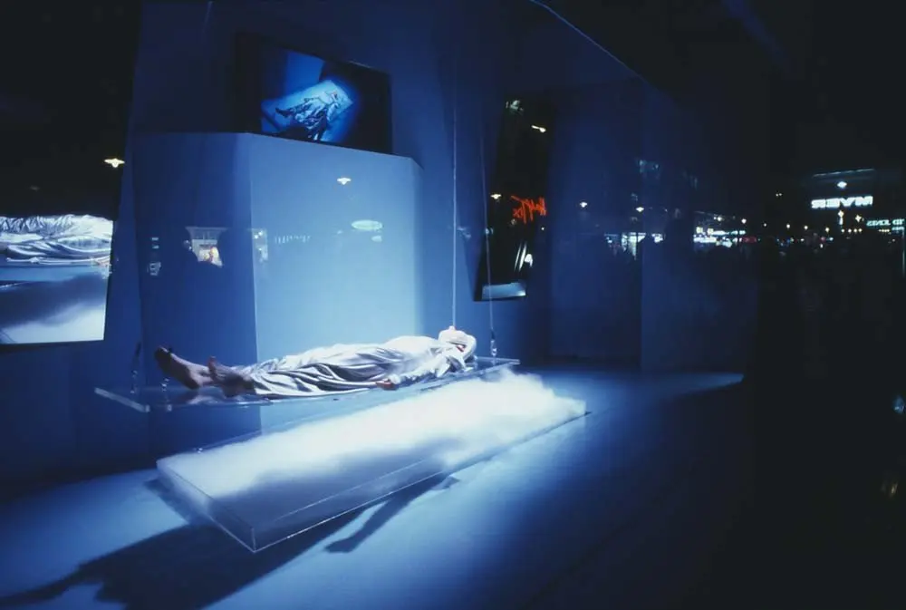 Melbourne International Film Festival, curated by Maudie Palmer, commissioned this work in 1997. The brief was to create a performance installation to operate for 17 days and nights. The performance installation was created for the four main display windows of the Myer department store, which was the first house of fashion created in the early days of Melbourne and which is still operating today. I focused on issues of fashion, the desire for the ideal body and the romance created by fashion which is never quite attainable. Hence the performances of Anorexia, the Ice Queen, Cracked Divas, Nocturna and the Panther, Doll, Cats, Mad Alice, etc. Each of the four windows was painted a different colour: a pastel pink and a dreamy blue for the more surreal and gentler emotions, a puke green and a reverberating orange for the more extreme actions like anorexia. I worked with slanted mirrors, Perspex slabs and Perspex coffins which were i nterchangeable and multi-functional sculptural elements, depending on the scenario. Coperformers were Lynne Santos and Gretel Taylor.