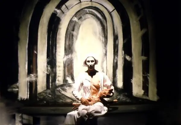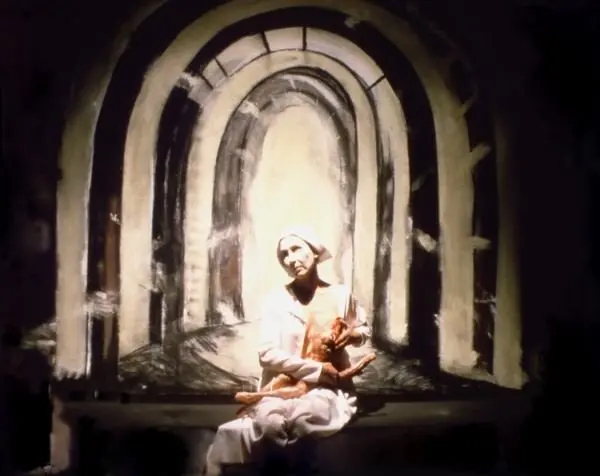 This work was an immediate response to my experience during the Myer Windows installation where the performances were behind the glass windows of the Bourke Street Mall. During the work, I saw drug overdoses, the homeless and a child who was in the audience daily. This child was not like the multitude of others; he was angry, aggressive and yet absorbed. His mother and he were followed one day only to discover that his mother was in the streets for her daily heroin hit. I could not get his hopeless state from my mind. The Hunger is a Pieta Study. I was asking questions such as: does Hitler's mother love him, despite authoring mass genocide? Does the mother of the serial killer still love the child? Do we love abberation that is born from ourselves? The lamb I birthed was dead. Due to its huge original size, it was reconstructed and sewn together anew to make it relative to my size. This has added another layer to the reading, from Frankenstein to genetic manipulation. Version 2 and 3 was performed in 2000 for the International Performance Art Festival, Quebec City, Quebec and for 11a 7b Art Festival, Toronto, Canada.